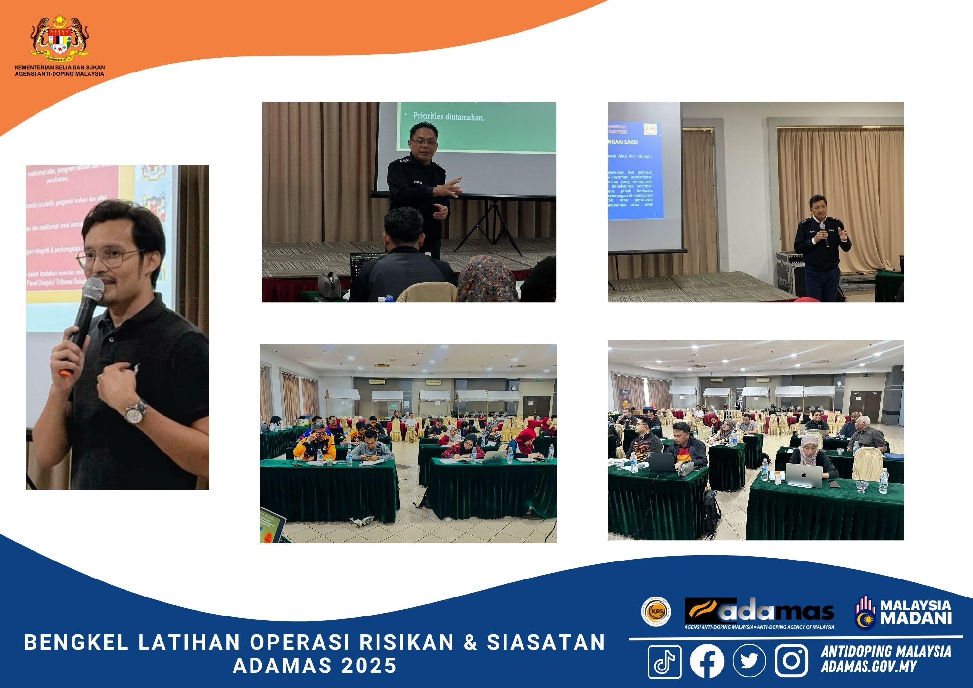 MUAR, JOHOR, 6–8 OGOS 2025 – Agensi Anti-Doping Malaysia (ADAMAS) telah menganjurkan Bengkel Latihan Operasi Risikan & Siasatan (LORIA) 2025 selama tiga hari bagi memperkukuh keupayaan pegawai dalam melaksanakan risikan dan siasatan mengikut piawaian antarabangsa.